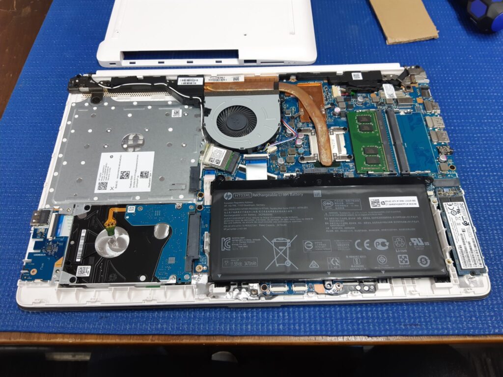 カバーを外すとHDDやメモリー、バッテリーが見えます。バッテリーに数か所ネジでとまっているので外していきます。