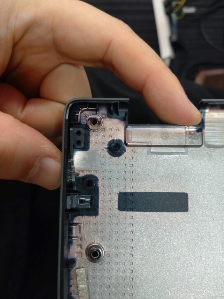 早速裏蓋を開けて状況を見ていく事にします。やはり、推測した通り、中のボタンの部分が壊れていてうまく電源ボタンを押せていない状況でした。