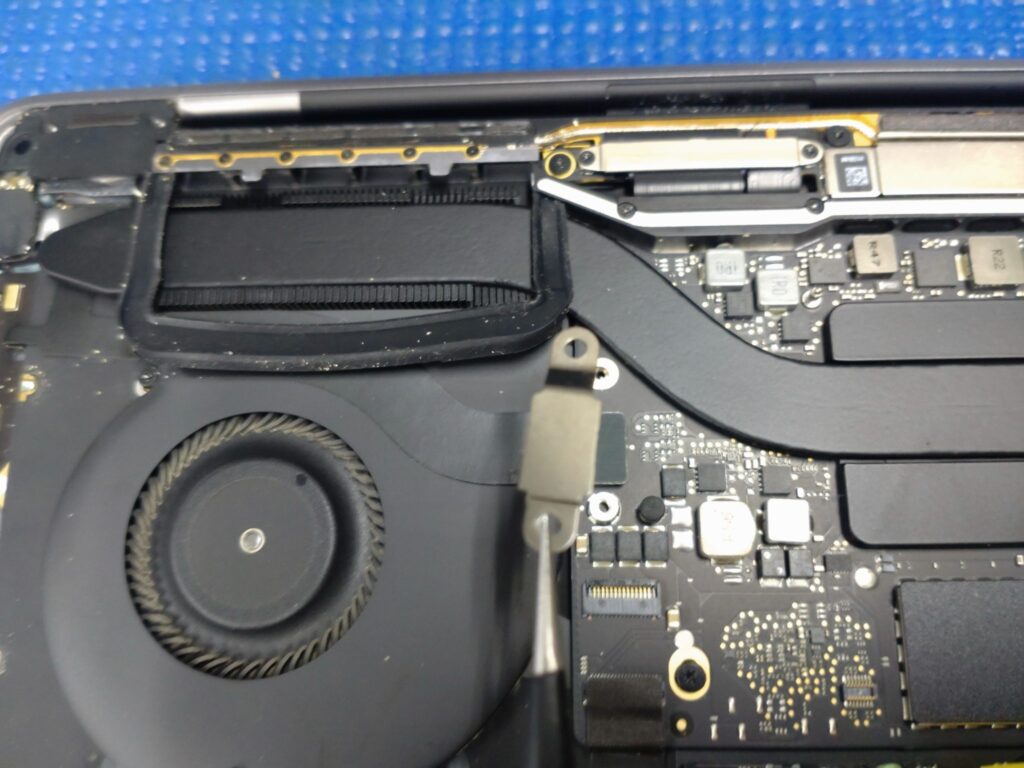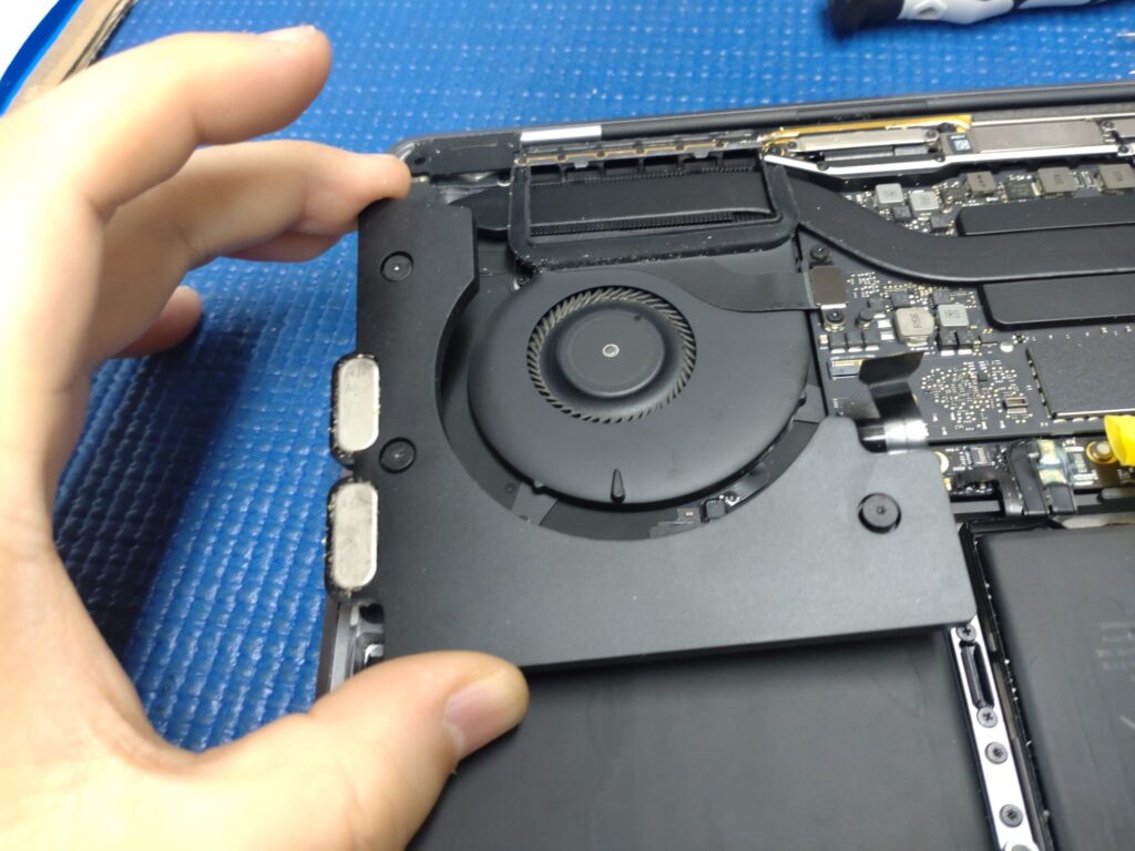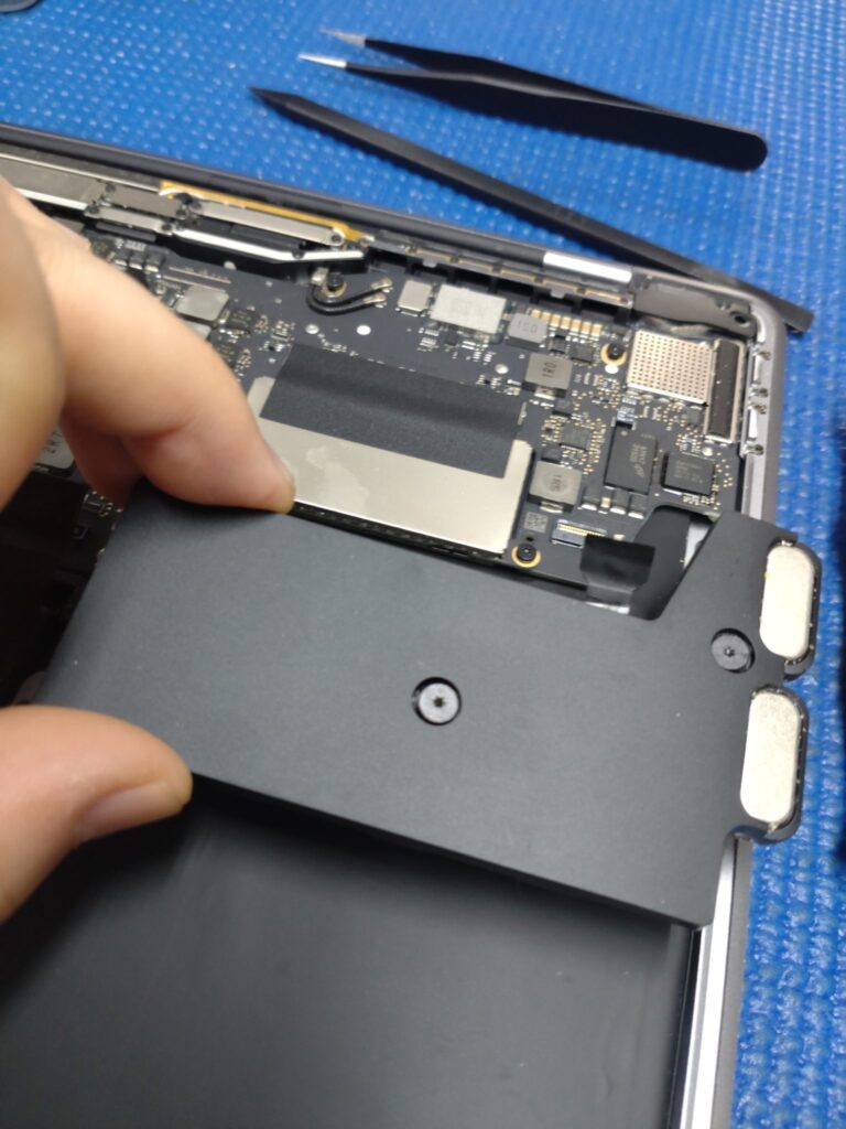 左右のスピーカー・CPUファン・WiFiのコネクタ等、様々な部品を外していきます。メインの基板も外し終えて後はバッテリーのみとなります。バッテリーは強力な両面テープで付いていますので、外すのは結構大変な作業となります。